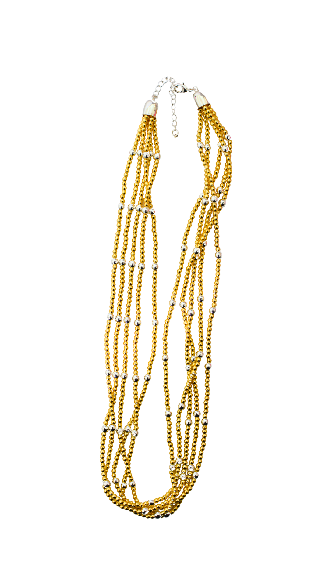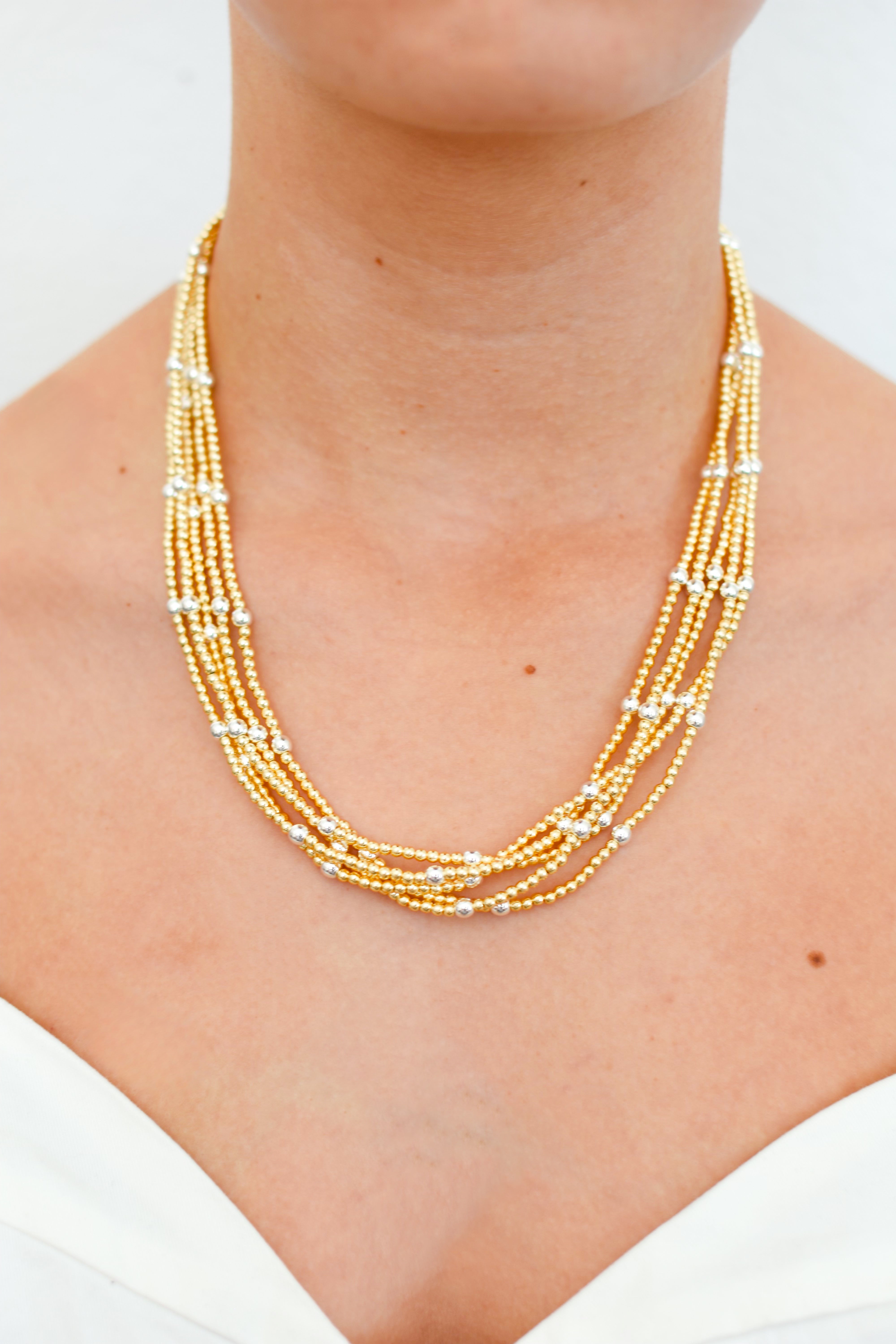 Elevate any look with this multi-strand necklace, featuring layered gold-toned chains accented with delicate silver beads. Its mix-metal design makes it perfect for both everyday wear and special occasions. Finished with an adjustable clasp for a comfortable, customizable fit.